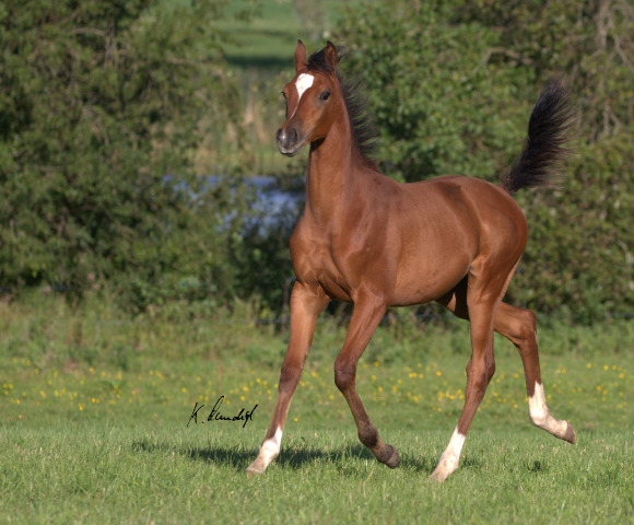 Nummer eins hat nun das Licht der Welt erblickt. Ein großrahmiges, langbeiniges Stutfohlen von Dajlan aus der Jewel of Joy. Eine gewisse Ähnlichkeit mit dem Großvater Bey Shy ist nicht zu übersehen.